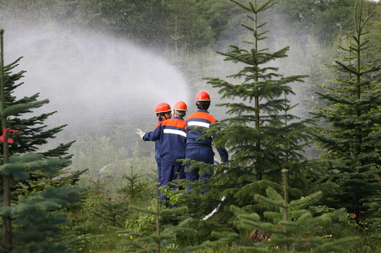 Feuerwehrleuten hat der Einsatz im Wald sichtlich Freude bereitet.