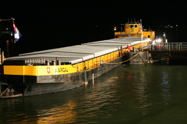 mit 1.600 t Weizen beladene Frachtschiff an einem Steiger in