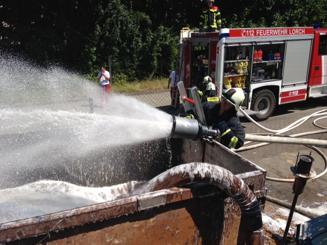 (HZ) Die Feuerwehr Lorch und der Rettungswagen wurden erneut in den Gewerbepark alarmiert. Der in der Nacht gebrannte Kübel hatte wieder angefangen zu Qualmen. Er wurde ausgeräumt und mit Schaum erneut abgelöscht.