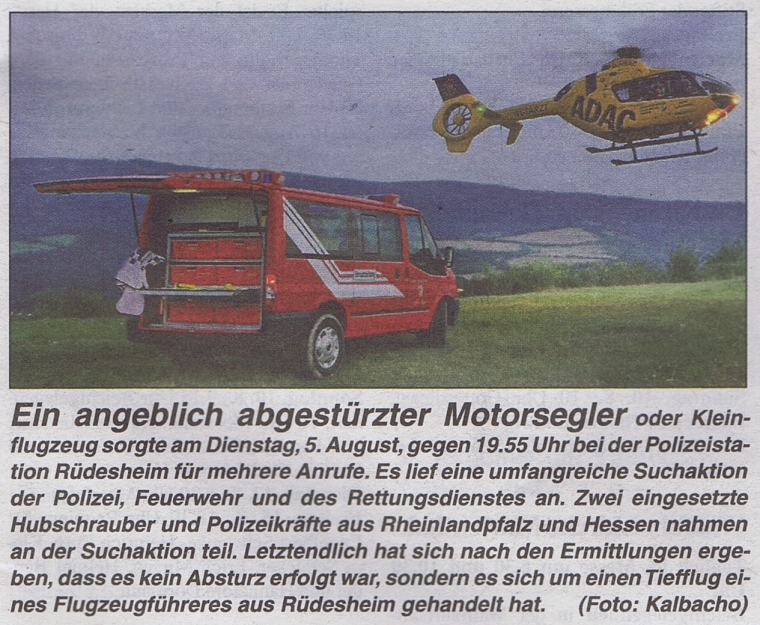 07.08.2014 - Abgestürtztes Kleinflugteug Bericht im Rheingau Echo