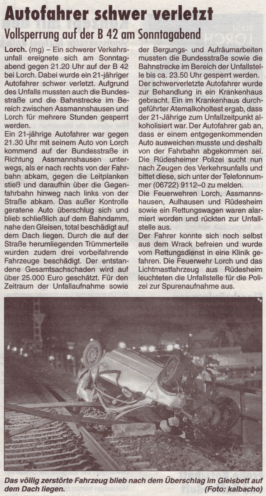 Aben zu einem Verkehrsunfall auf der B42 zwischen Lorch und