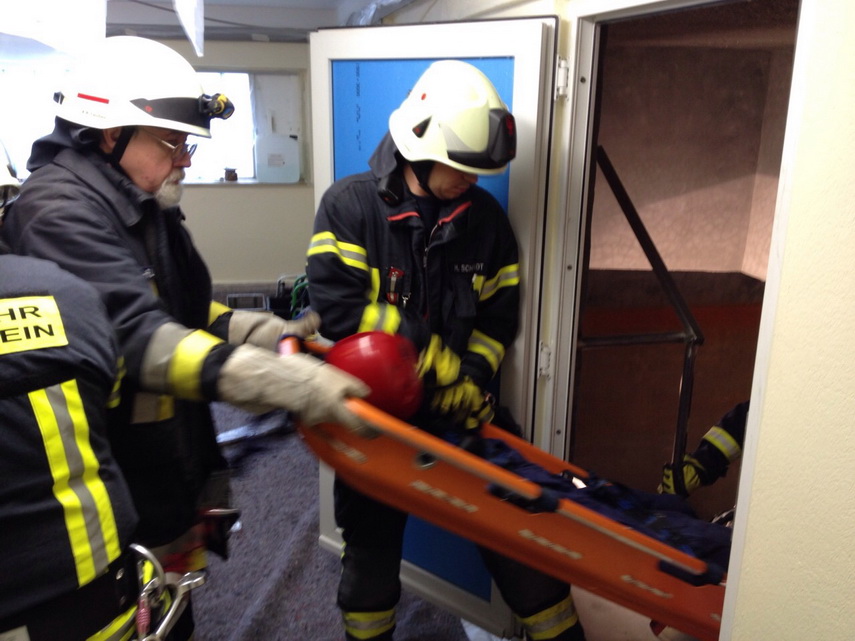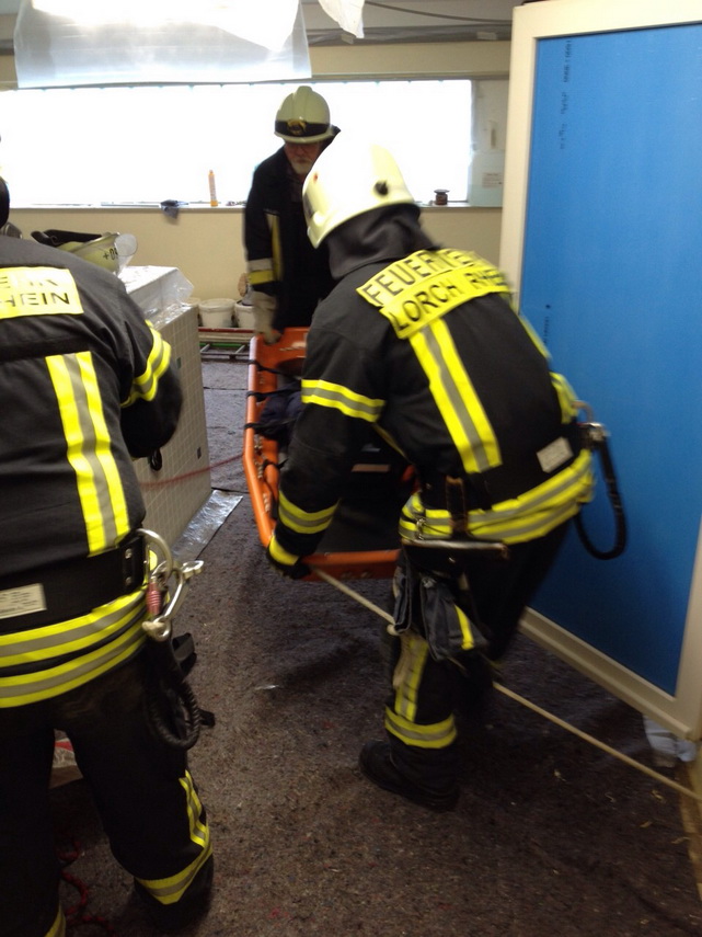 Kammer. Die Person wurde mit Hilfe der Schleifkorbtrage über die
