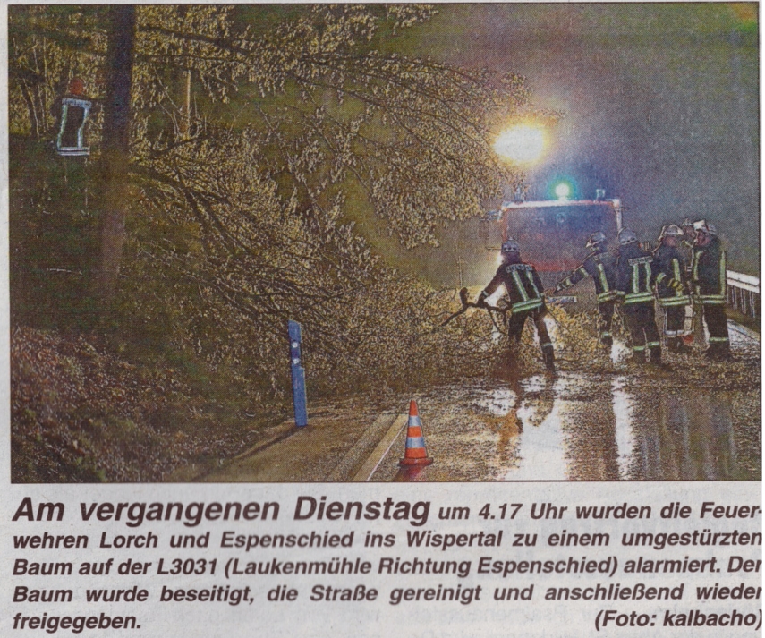 (HZ) Die Feuerwehren Lorch und Espenschied wurden heute morgen zu einem umgestürzten Baum auf der L3031 (Laukenmühle Richtung Espenschied) alarmiert. Der Baum wurde beseitigt, die Straße gereinigt und anschließend wieder freigegeben.