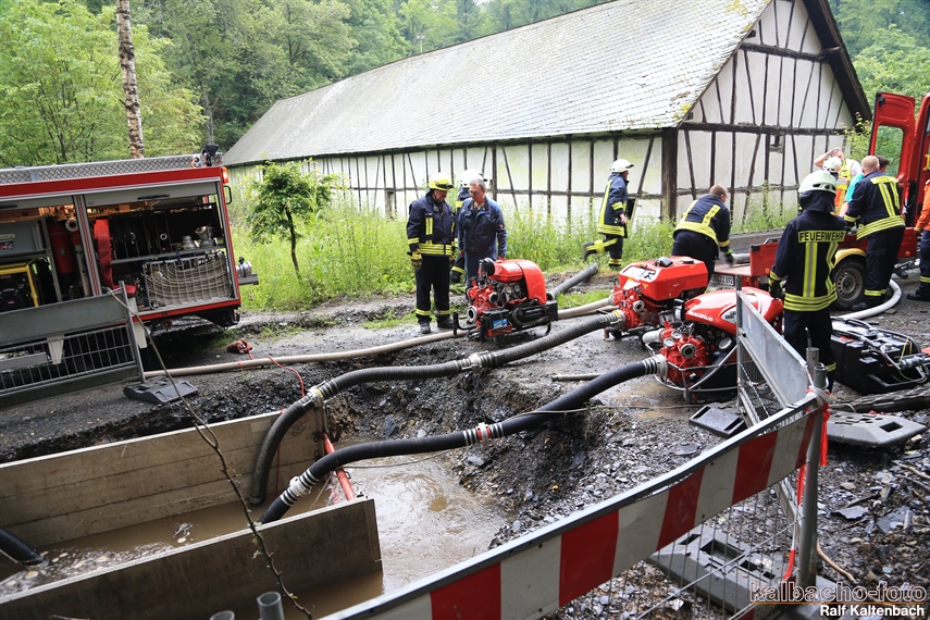 Mit z.T. 5 Tragkraftspritzen gleichzeitig wurde pro Minute Ca. 3500 Liter an der Grube vorbei geleitet und so eine Überflutung verhindert.