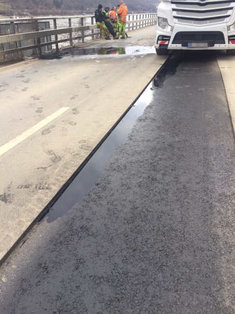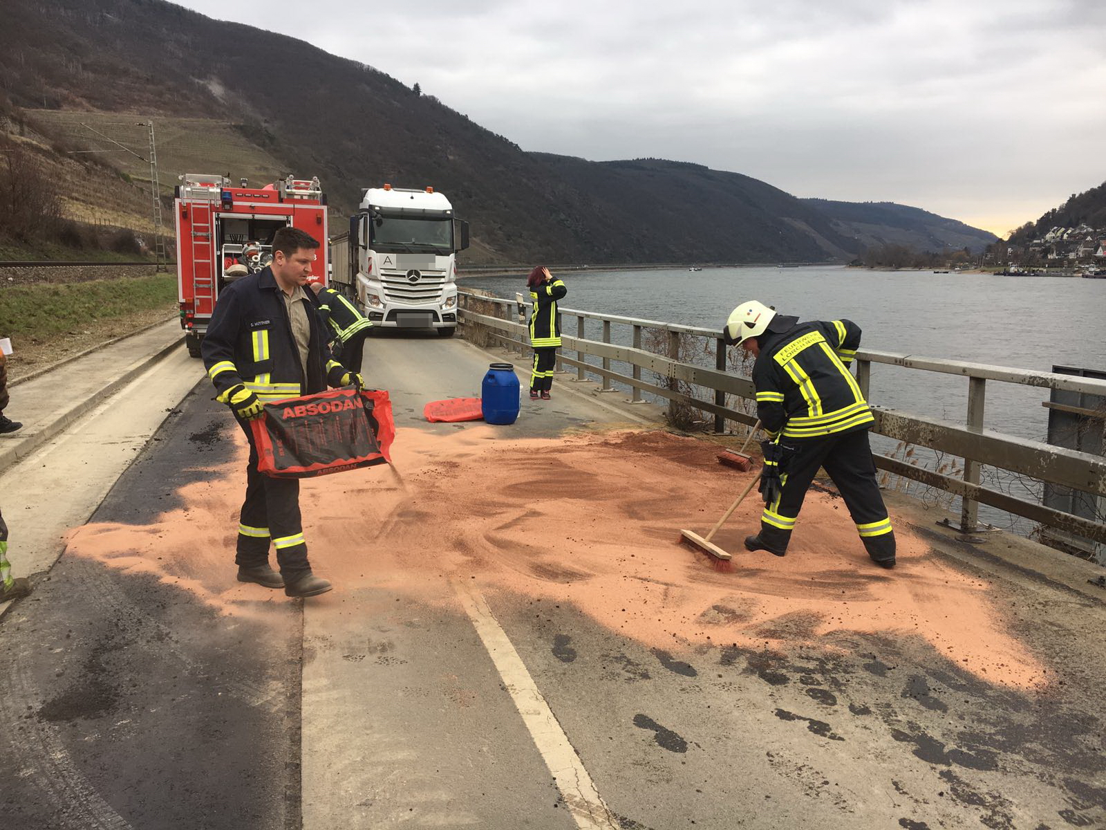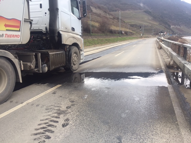 (HZ) Die Feuerwehren Lorch und Lorchhausen wurden heute Mittag zu einer Ölspur im Bereich der Baustelle auf der B42 alarmiert. Bei einem Baustellenfahrzeug war eine Hydraulikleitung geplatzt und das Öl drohte über die Fahrbahn in den Rhein zu laufen. Beim Eintreffen hatten die Mitarbeiter der Baufirma schon einen Wall aus Sand und Teer angebracht um das ausbreiten zu verhindern. Die Feuerwehr streute die Ölspur ab und übergab die Einsatzstelle an den Bauleiter.