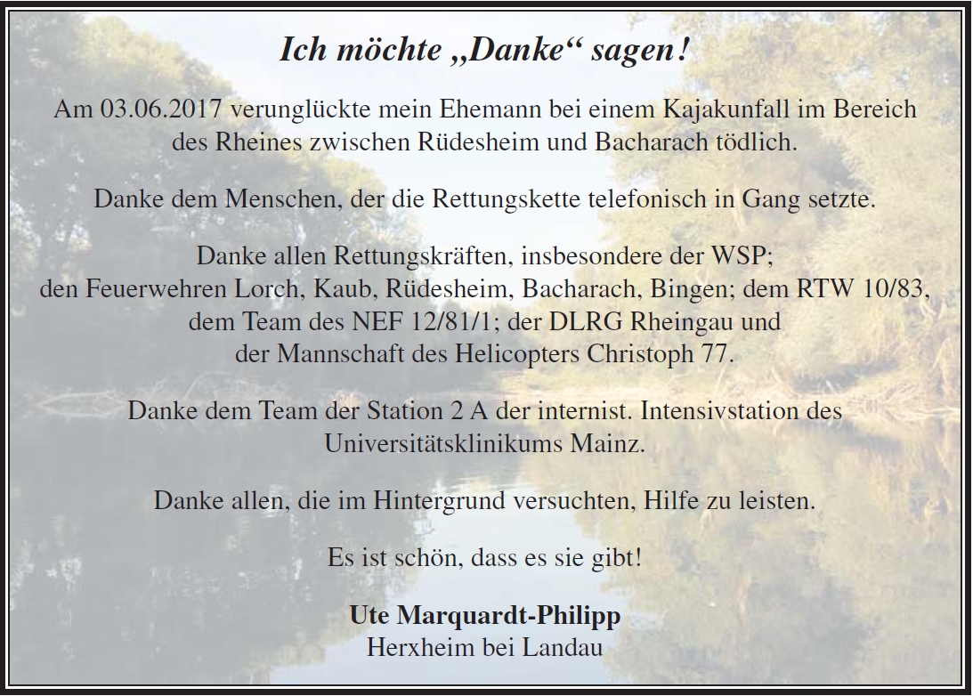 einen Blitzschlag mit seinem Kajak bei Lorch kenterte und bewusstlos im