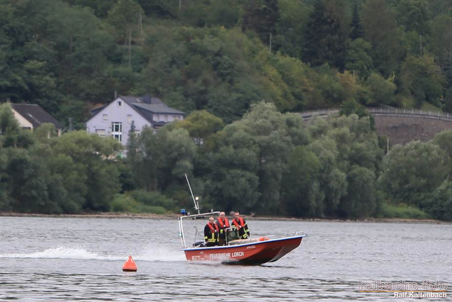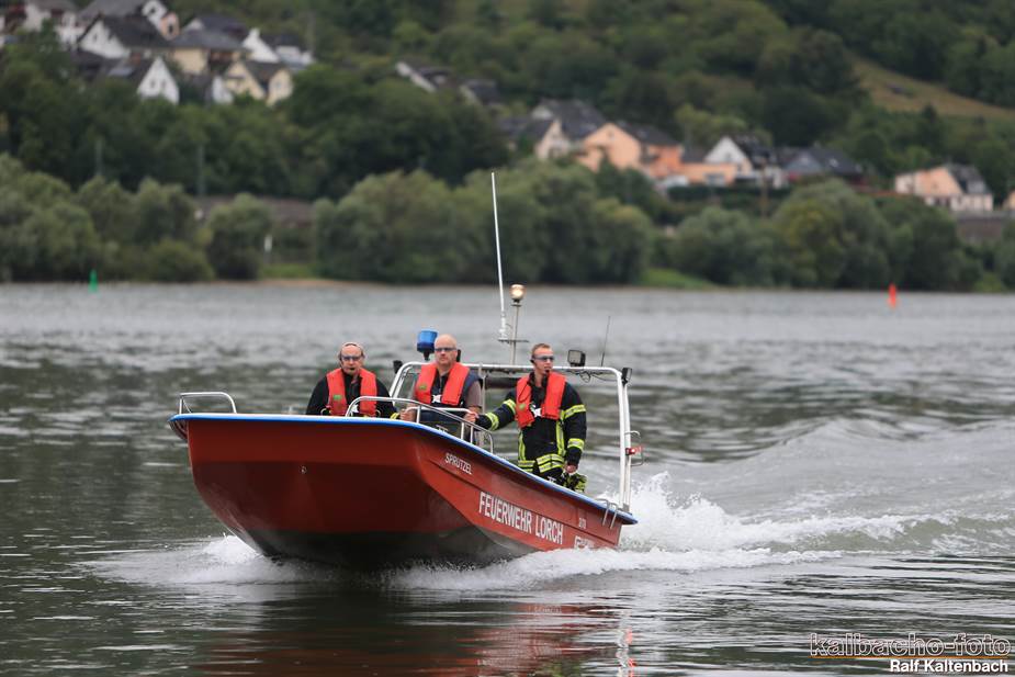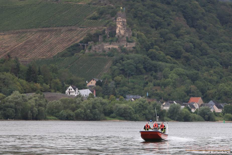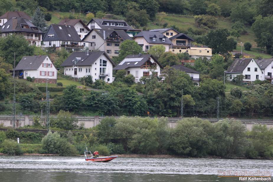 Rettungskräfte von DLRG und Wasserschutzpolizei Rüdesheim die Person von