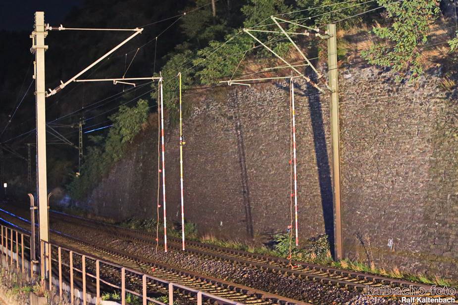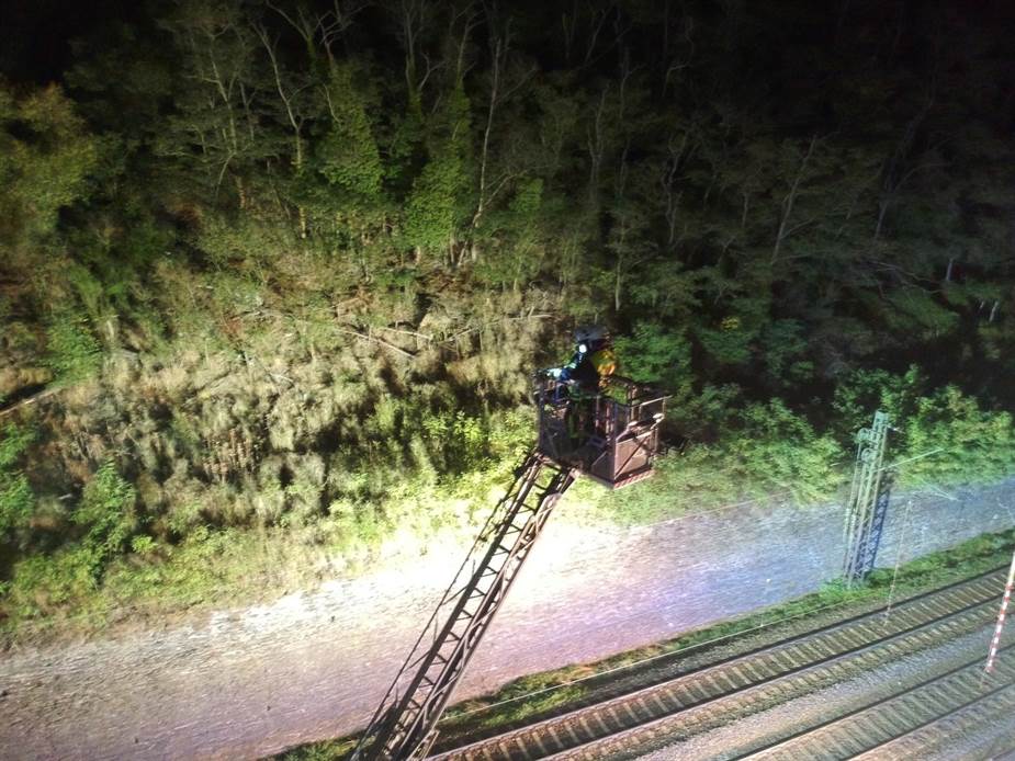 oberhalb der Bahn im Waldbereich. Die Drehleiter