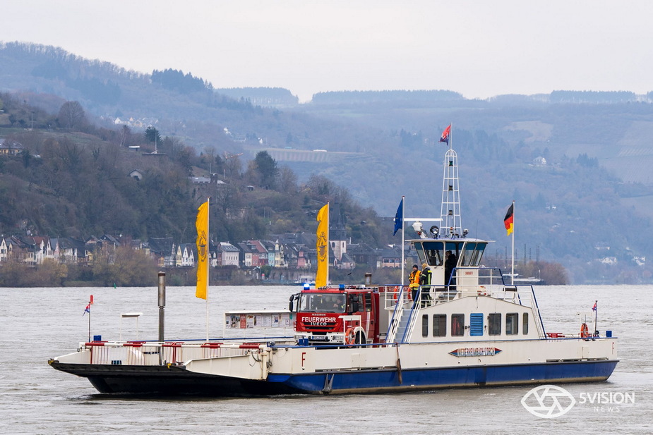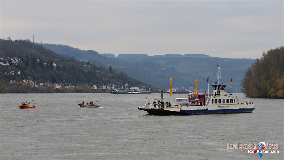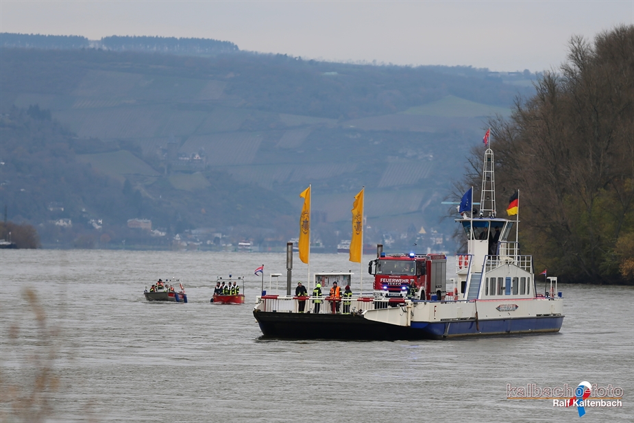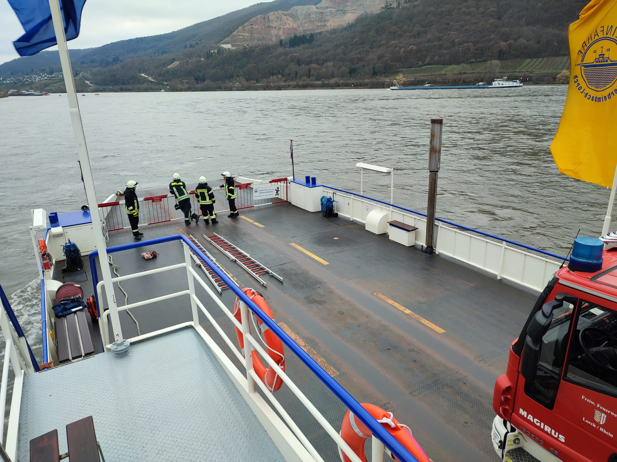 der Feuerwehr wurden auf die Autofähre in Lorch geladen, um von dort