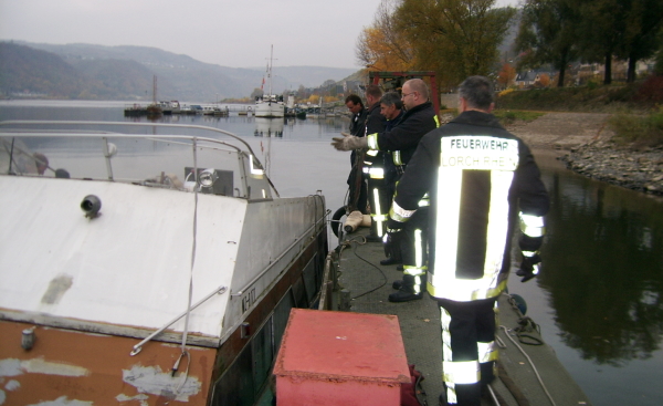 03.11.2007 Um 16 Uhr 23 wurde die Feuerwehr Lorch zum Auspumpen eines Sportbootes alarmiert. Das Boot war aus bisher ungeklärter Ursache am Steiger voll Wasser gelaufen und gesunken. Da Betriebsstoffe austraten empfahl die Wasserschutzpolizei das Boot auszupumpen und mit Hilfe eines anderen Bootes zu Heben. Es mußten drei Tauchpumpen eingesetzt werden um das Boot wieder zum schwimmen zu bringen. Danach wurde das Boot an Land gezogen um es dann durch einen Kran aus dem Wasser zu heben.