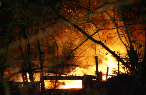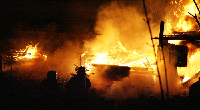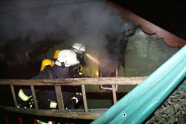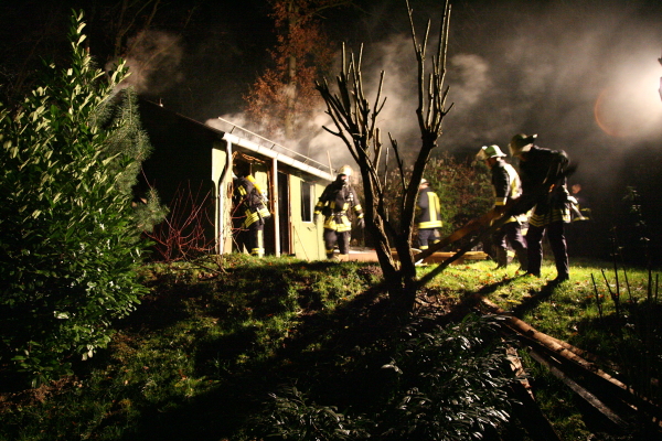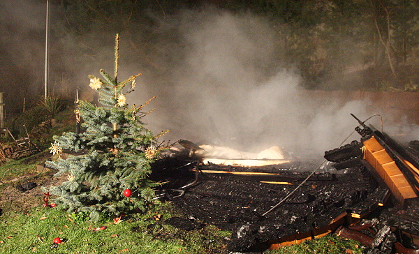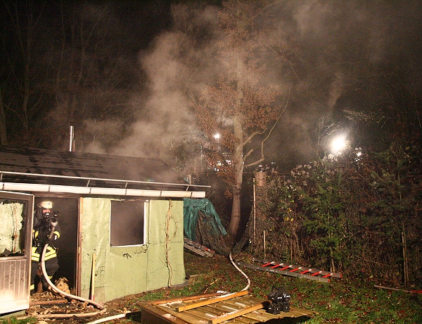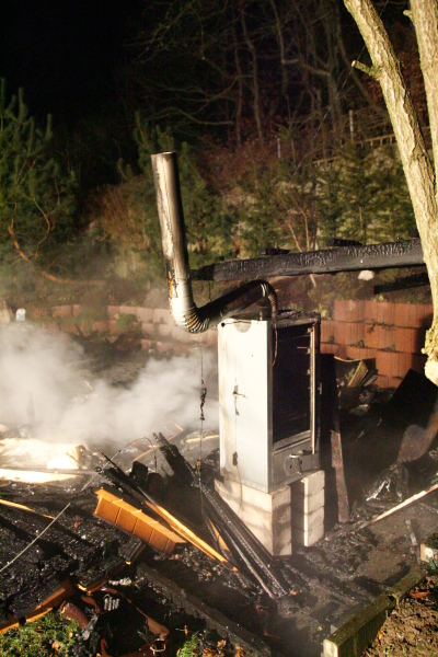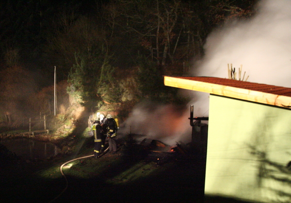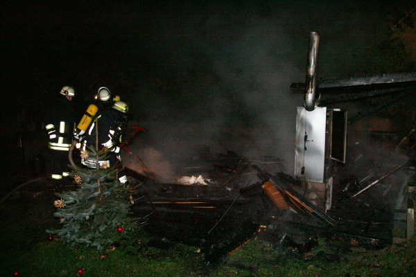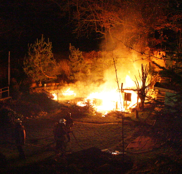 Trotz schnellem eingreifen der Feuerwehr brannte die eine Hütte bis auf die Grundmauern nieder. An der zweiten Hütte entstand sehr hoher Sachschaden.