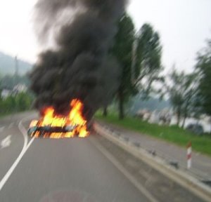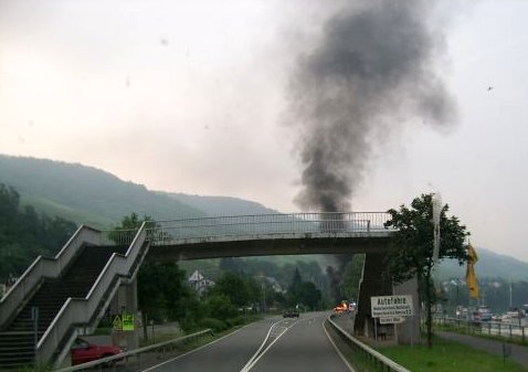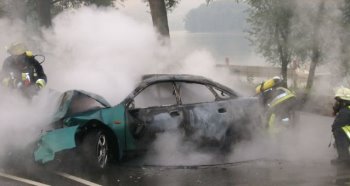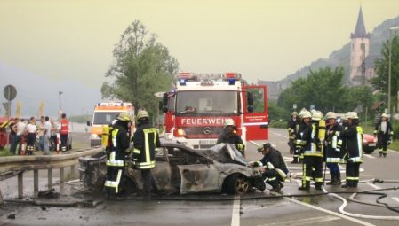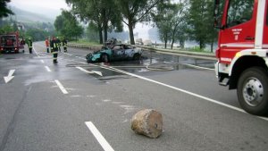 Brand eines Pkw´s Bei Eintreffen der Feuerwehr brannte der Pkw in voller Ausdehnung. Zum Glück befand sich zu diesem Zeitpunkt niemand mehr im Fahrzeug. Zwei Trupps unter Atemschutz löschten den Pkw ab. Die Feuerwehr sichert den fliesenden Verkehr ab und übernahm zusammen mit der Strassenmeisterrei die Reinigung der Fahrbahn.