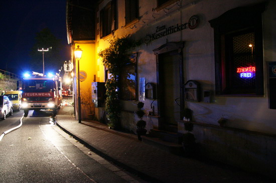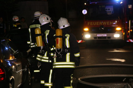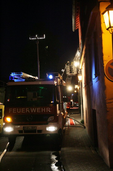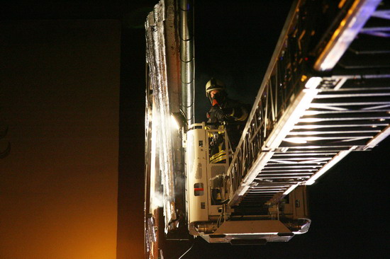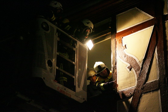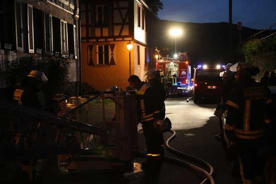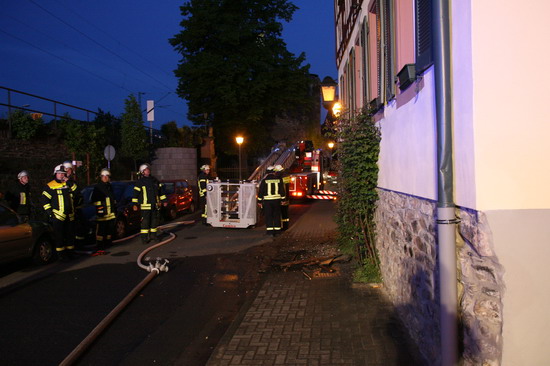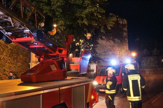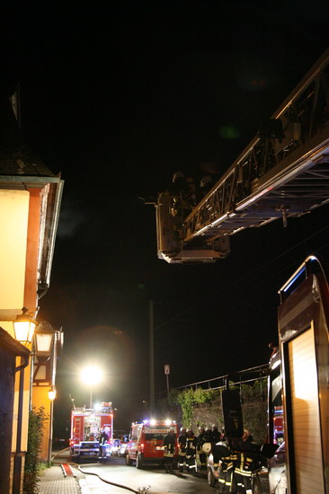 Atemschutz über die Drehleiter aus Rüdesheim zur Brandbekämpfung