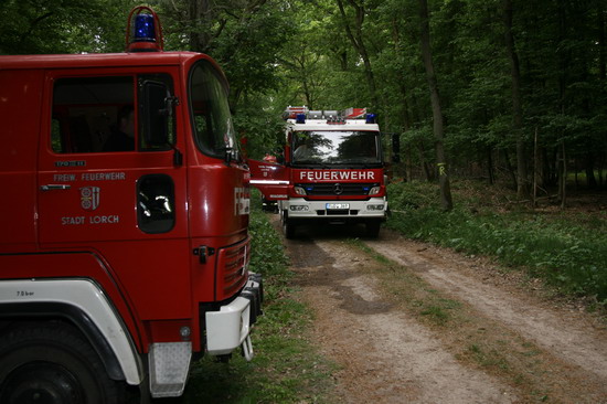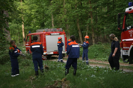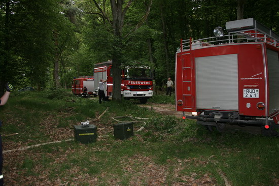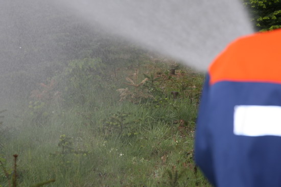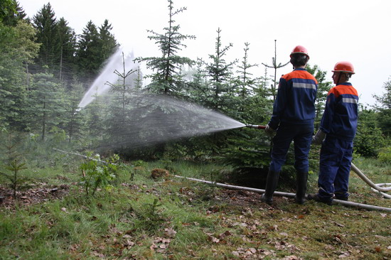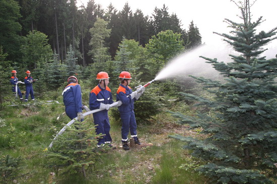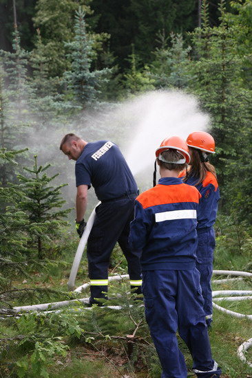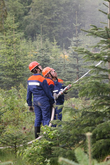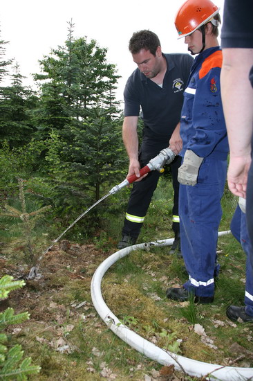 Feuerwehrleuten hat der Einsatz im Wald sichtlich Freude bereitet.