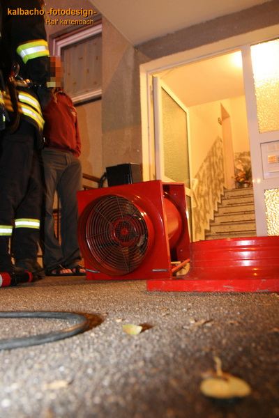 Kellergeschosswohnung , angebranntes Kochgut , ein Hochdrucklüfter im Einsatz .