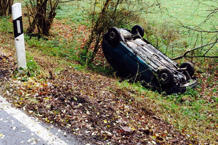 Der PKW lag auf dem Dach etwa 4m unterhalb der Straße im Feld. Die