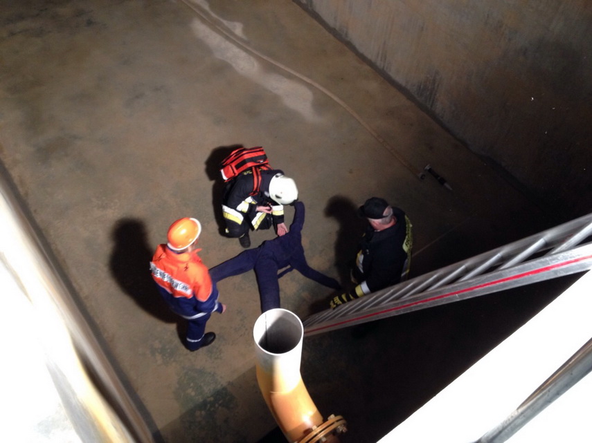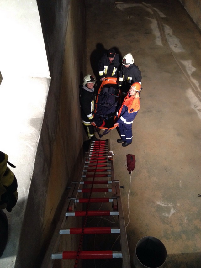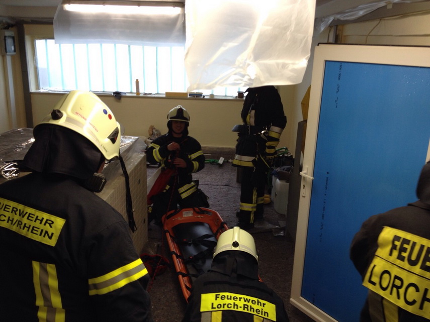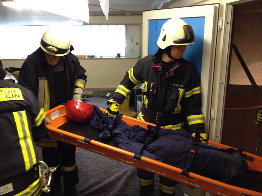 Kammer. Die Person wurde mit Hilfe der Schleifkorbtrage über die