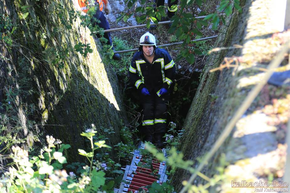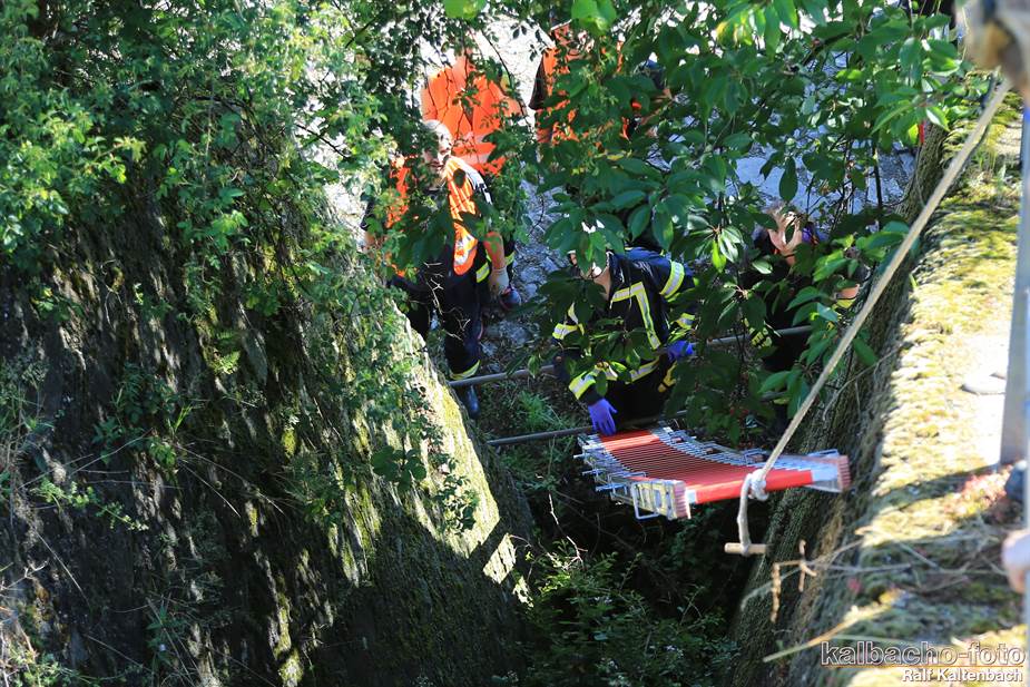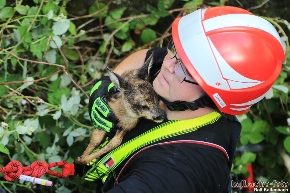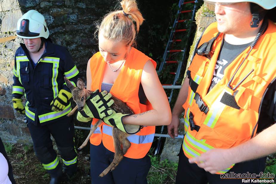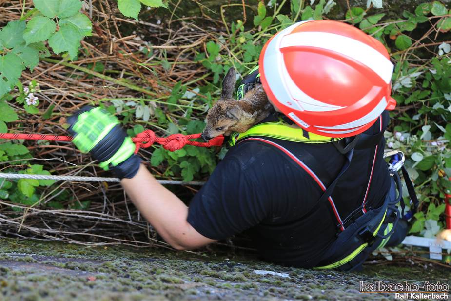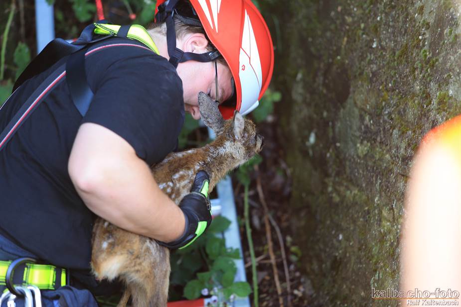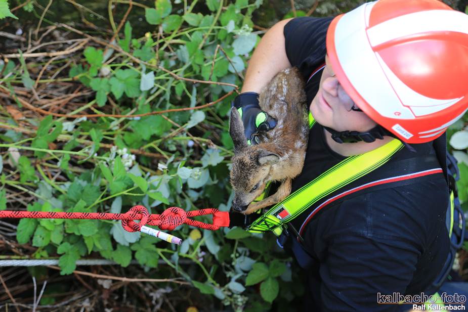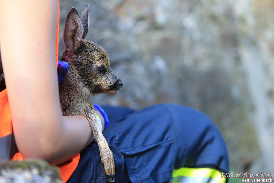 Ein Reh war aus 3 Meter Höhe in einen Flutgraben gestürzt.