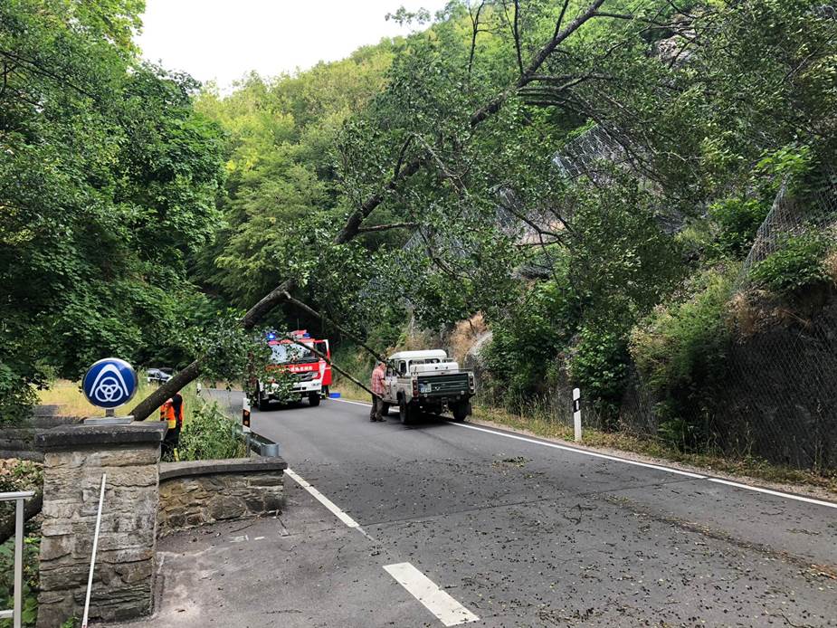ein Baum schräg über die Fahrbahn gestürzt.