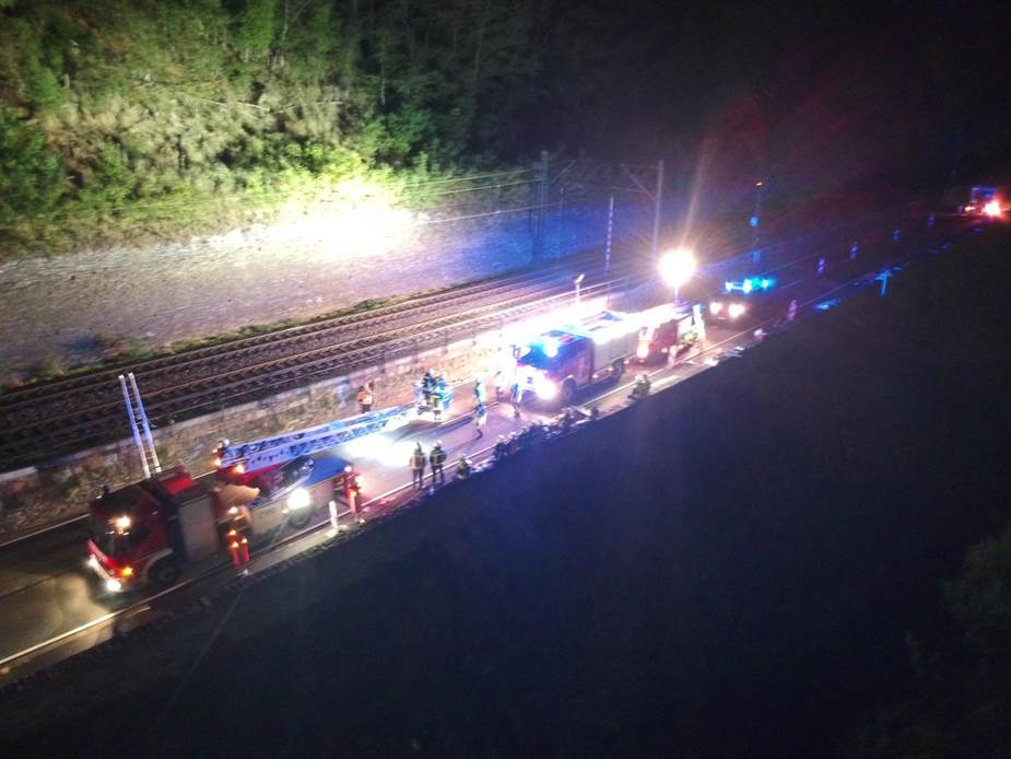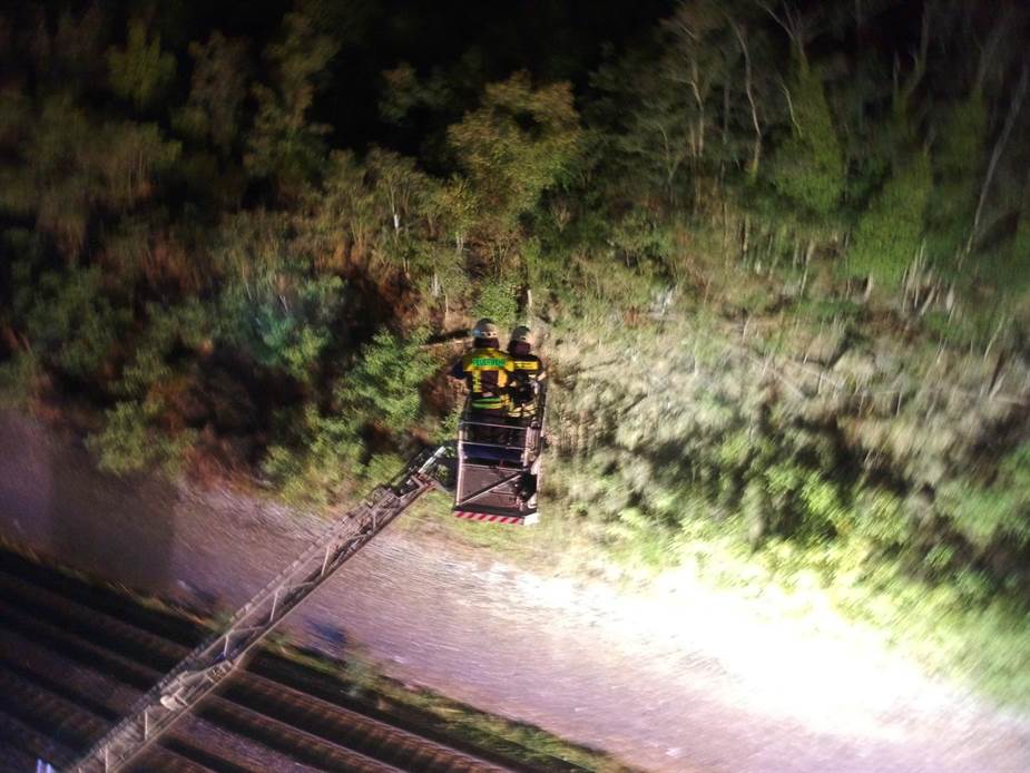 oberhalb der Bahn im Waldbereich. Die Drehleiter