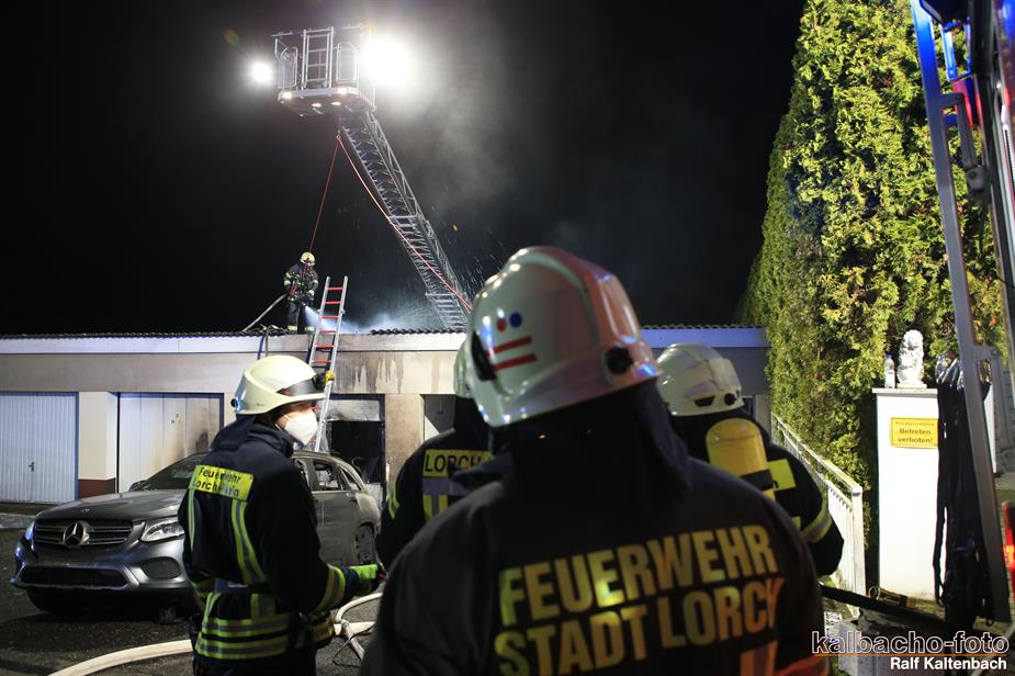 Nachthimmel und das Feuer breitete sich auf die angrenzenden Garagen