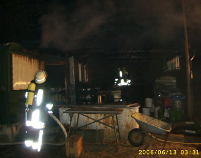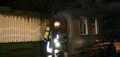 Brand eines Gartenhauses Bei Eintreffen der Feuerwehr brannte das Dach des Gartenhausses in voller Ausdehnung. Ein Trupp unter Atemschutz löschte das Haus ab und suchte unter der Dachdämmung nach weiteren Glutnestern.